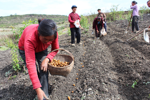 ▲时下,正是马铃薯开花的季节,然而雪山镇锅底村的村民还在忙着种植马铃薯。据了解,今年该镇从荔波引进马铃薯新品种进行实验种植,该品种具有生长周期短、个头大、年种植两季、收益高等优点。图为当地村民在抢种新品种马铃薯。(李建军 摄)