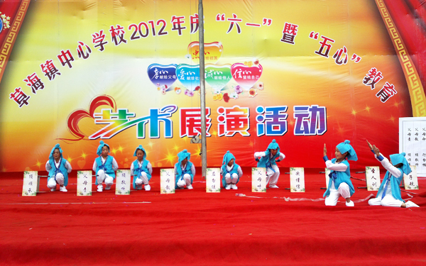 ▲5月28日,草海镇组织该镇12所小学在草海中心校共同举行庆“六一”暨“五心”教育艺术展演活动。活动现场,小演员们个个兴高采烈,由各校师学自编自演的《跪羊图》、《魔术表演》、《天竺少女》、《弟子规》等二十余个节目精彩纷呈,现场一片欢腾。图为小朋友们表演的舞蹈《跪羊图》。