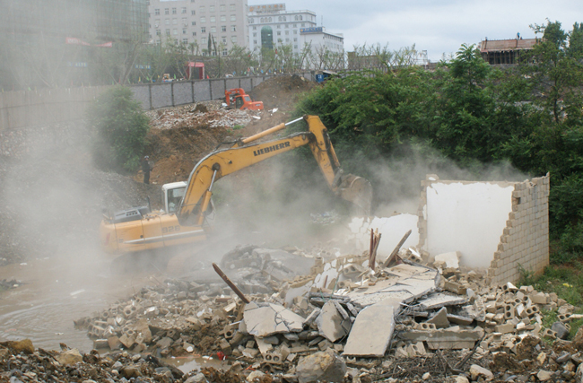 6月2日,我县房产、土地征管、规划等部门联合对乌撒广场建设用地内一已征收房屋进行依法拆除。政协主席禄俊现场指挥拆除工作。图为拆除现场。(苏升 摄)