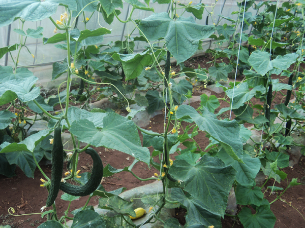 ▲岔河乡岔河村大棚蔬菜种植的黄瓜、西红柿等蔬菜获得丰收。据了解,该项目由县扶贫办投资170万元建成100个大棚,由岔河村两委牵头,流转土地55亩,在农牧局农技推广中心指导下,可解决200多贫困人口的劳务报酬。图为大棚里长势宜人的黄瓜。