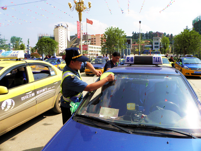 活动现场,近200名出租车司机踊跃报名,交管工作人员现场为参与活动的170余辆出租车悬挂绿丝带标志,并张贴“威宁自治县第二届‘爱心助高考’活动服务车”标识。据了解,高考期间,参加高考学子可凭准考证享受优质、便捷、安全的免费出行服务。图为交管工作人员在张贴绿丝带标识。