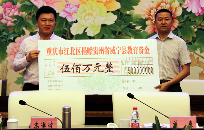 会上,高洪波代表江北区向我县捐赠了500万元的教育资金。同时,该区发改委表示,在下一步的工作中还将对我县医疗卫生设备采购、医务人员培训、白内障手术的医疗救助、50名女职中威宁女子班的招生等方面工作进行帮扶,同时将组织农产品生产与销售企业、旅游业发展企业到我县参观考察进行投资创业。 (本报记者 张锋)
