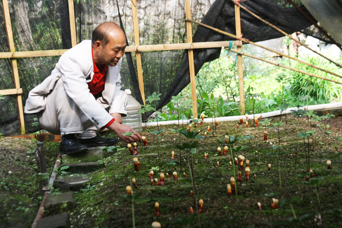 目前,翁定华种植的灵芝长势良好,预计7月份就可采收,人工种植灵芝在我县乃至全市尚属首例。图为翁定华正在查看灵芝长势。(本报记者 王德聪)