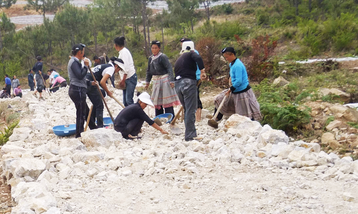 据了解,今年,新山村争取到一事一议财政奖补资金33万多元,硬化通组路1900多米。目前,村民投工投劳情绪高涨,苗寨通组路的建设,让该村1000多苗族同胞从此将告别泥泞路,走上了干净平坦的水泥路。图为苗族同胞正在铺石头。