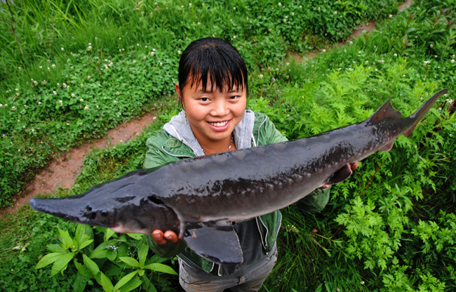 目前,翟剑超夫妇正在盘算着在养殖场周围新建一个集餐饮、观光、休闲为一体的农家乐,好让更多的人都来体验他们的原生态特色养殖场及特色美味。图为刘美娥在展示她养殖的中华鲟。 (实习记者 杨文斌)