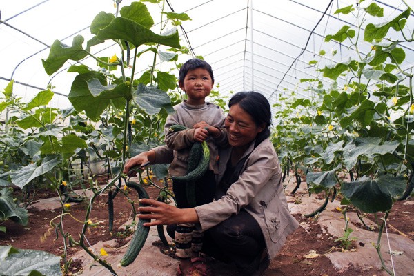 ▲近年来,黑石头镇紧紧依托得天独厚的地域优势和气候条件积极引导农户种植反季节、绿色无公害蔬菜。截止日前,该镇引导三河村农户共建大棚170余个,蔬菜种植户每年增收上万元。图为该村农妇崔红群带着孩子在自己的大棚里喜收黄瓜。(文贵 摄)