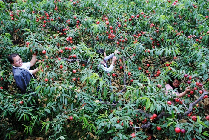 无公害大规模生态水果种植,即富了农民,又美了山川。让原本水土流失较严重的龙场镇,山川重披绿装,硕果重挂枝头,有力地推动了当地生态水果产业和经济社会的快速发展。图为游客们在树舍水果基地里亲手喜摘水果。