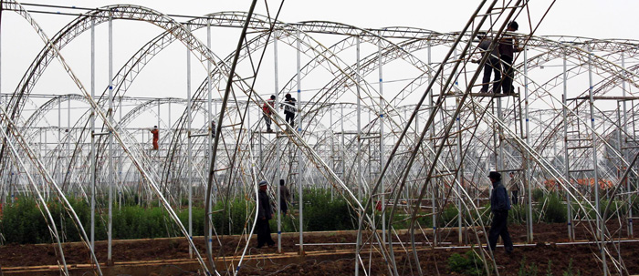 据了解,鸭子村塘距县城7公里,位于草海湖畔鸭子塘326国道与102省道交汇处,乐义百家蔬菜示范基地是去年我县引进的大型企业,总投资投资4100万元,该公司落户我县后,采取土地流转和“公司+基地+市场+农户”的运作模式,1个大棚年纯收入8万元以上,建设面积1000亩,带动面积达30000亩。蔬菜种植区土地年均亩产值达8000元以上,每亩纯收入达5000元以上。通过土地流转,当地村民还能拿到1000元一亩的土地租金,在基地打工的村民,年收入达15000元以上。图为工人在安装大棚钢架。