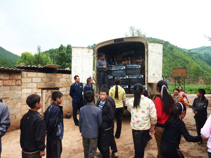 ▲近日,由自治县个体劳动者私营企业协会草海分会及威宁乾威门窗加工厂为幺站镇岔河小学赠送桌椅80套。图为搬运现场。