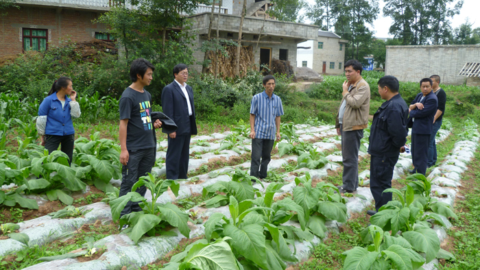 ▲连日来,持续阴雨导致羊街镇烤烟生长缓慢,烟株铁杆早花等现象。据统计,该镇11个种烟村就有10个村2373亩烤烟不同程度出现烟苗烂杆、铁杆早花等现象,当地烟农迫切希望烟草部门采取措施。图为该镇组成工作组到现场查看灾情。 (羊街党政办 摄)