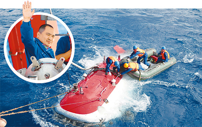 “蛟龙”号完成了7000米级海试第二次下潜试验,下潜最大深度达6965米。未来几天,“蛟龙”号还将下潜并冲击7000米深度。(新华社记者 罗沙 摄)