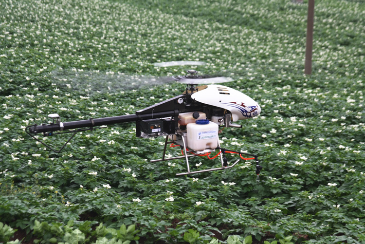 据了解,该无人驾驶直升机载重量30公斤,飞行高度3至50米,飞行速度每秒3至7米,每分钟可施药2亩,每小时施药超过100亩,每天工作4小时,相当于100个劳动力工作1天。该无人驾驶直升机具有节水、优质、全能、安全、起降灵活等优点,特别适用于土地集中度不高的地方使用。图为无人驾驶直升机正在南方马铃薯专业合作社基地喷洒农药。 (本报记者 王德聪)