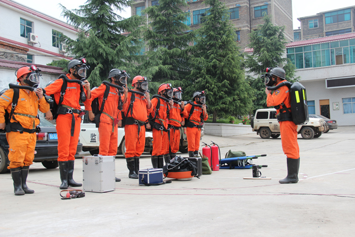 “铃铃,叮铃铃…”着一阵清脆的铃声响起,队员们立即闻警集合,快速检查装备,佩带氧气呼吸器携等装备上车出发,整个过程不到60秒 。这是6月25日自治县安监局矿山救护队进行模拟应急救援演练的一个现场。