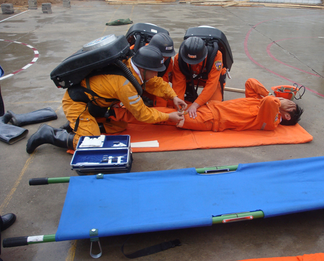 到达现场后,第一小队两名队员马上架设灾区电话进入井下侦察,5分钟后,井下人员报告:“井下氧气浓度、硫化氢、二氧化碳浓度在安全值内,请指示!“立即寻找被困人员,继续前进侦察。”地面指挥部通过灾区电话发出指令。15分钟后,在井下250米处找到被困人员,一名队员对伤员的伤情进行检查,另两名队员迅速将止血带扎紧后,在伤腿下安放好血垫位,四名救护队员立即用担架将伤员抬出。其余五名队员继续侦察井下火灾情况。5分钟后,伤员被抬出地面,救护队员立即对伤员受伤部位进行清创、然后用夹板固定包扎,整个过程忙而有序,8分钟完成,完全达到矿山救护大纲要求。这时,井下侦察人员报告:井下各种有毒有害气体严重超标,井下火灾蔓延,温度骤升。