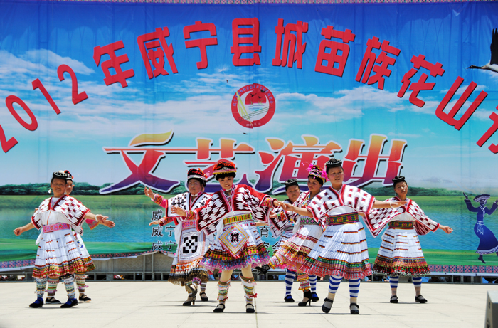 我县苗族“花山节”在每年的端午节期间举行,这天,苗族同胞们盛情邀约各地各民族同胞,齐聚花山,踩花山、互敬酒,互祝福,青年男女们则借助对唱山歌、跳芦笙等方式,互诉衷肠、交朋结友,一旦相爱,男的要以花裹脚,用花围腰带赠送姑娘,而女的也以自己千针万线亲手绣制的花帕、包头回赠情郎,整个“花山”沉浸在一片甜蜜热闹的气氛里。下图为文艺演出现场。 (实习记者 杨文斌)