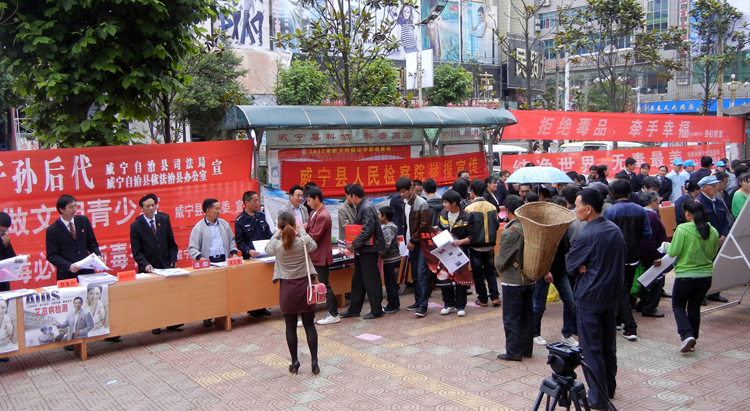 ▲6月26日是"国际禁毒日",当天,自治县禁毒委牵头组织政法、法院、公安局、教育局等禁毒委员会成员单位在人民中路开展主题为"禁绝毒品、铸造平安、阳光关爱、构建和谐"系列宣传活动,营造了全民禁毒的良好氛围,宣传了毒品的种类和危害,提高了大家识别、防范和抵御毒品的意识和能力。据了解,此次活动共制作宣传标语20余条,展板12块,出动宣传车1辆,发放各类禁毒宣传资料30000多份,现场接受群众咨询150余人次,收到良好效果。