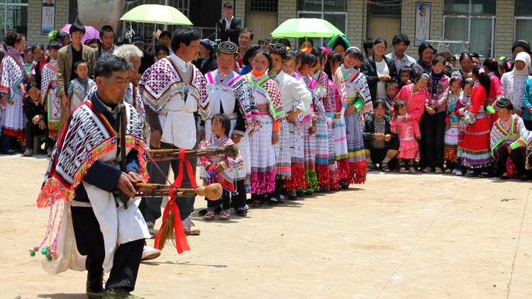 ▲近日,斗古乡中心小学举行第五届苗族花山节文艺汇演活动,活动现场,身着盛装的苗族同胞吹起芦笙,跳起舞蹈,现场一片欢腾。图为演出现场。(李强 摄)