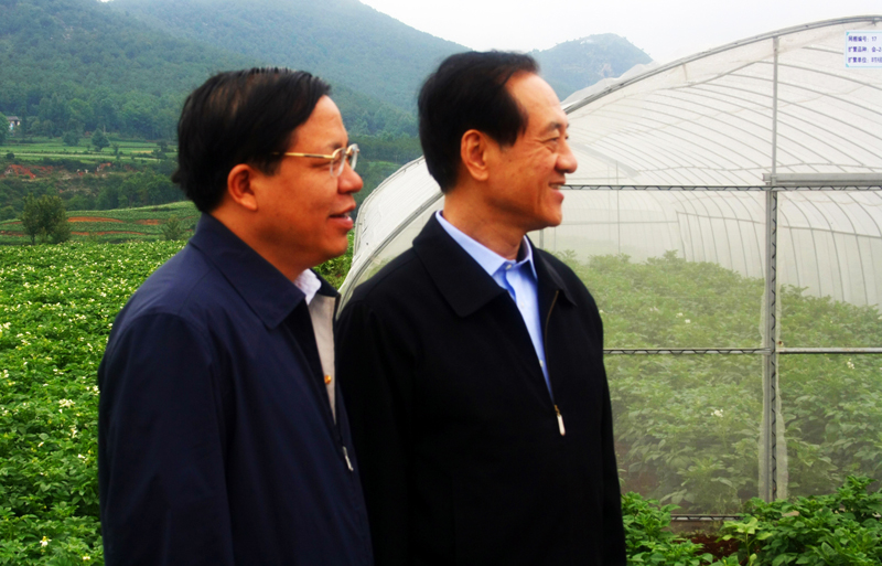 全国人大常委会副委员长韩启德(右)在省委常委、市委书记秦如培(左)陪同下到我县调研马铃薯产业情况。(许定华 摄)