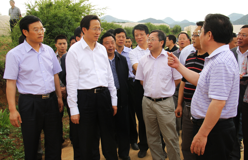 农业部部长韩长赋(左二)在市委副书记、市长张吉勇(左一)等领导陪同下到我县草海镇白岩村调研马铃薯产业情况。 (叶启伟 摄)