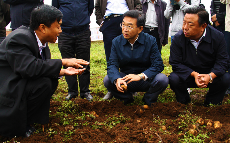农业部副部长张桃林(中)到我县调研时走进田间地头了解马铃薯单产产量。 (叶启伟 摄)