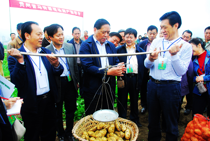 副省长禄智明(中)在我县调研时参与马铃薯测产。(李怀奎 摄)