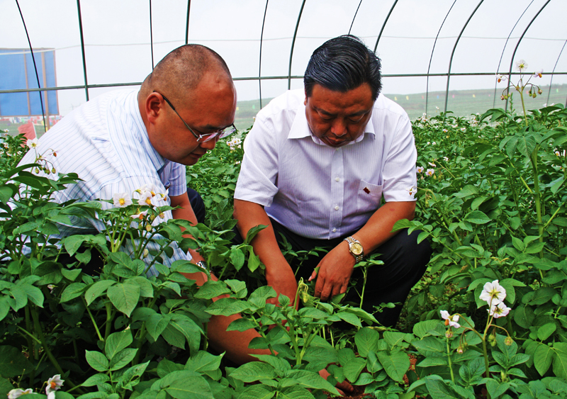 市委常委、自治县委书记杨兴友(右)到草海马铃薯专业合作社基地查看种薯培育情况。 (叶启伟 摄)