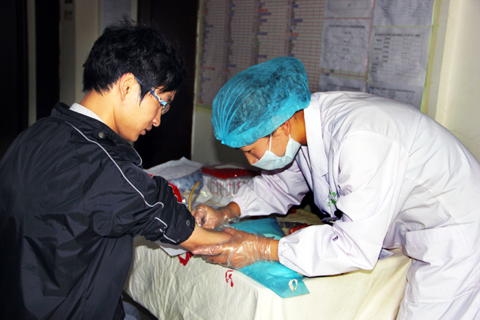 ▲6月28日至29日,城关社区卫生服务中心开展义诊活动,为社区居民免费体检。图为医务人员正在为就诊者抽取血样。 (本报记者 沈光勇 摄)