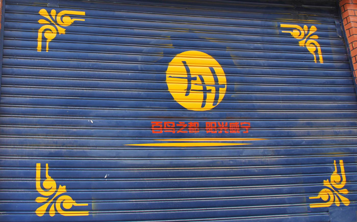 ▲日前,一幅幅飞翔的黑颈鹤图案和其他图案正在县城沿街商铺门面上栩栩如生的展现,不但增加了城市的美感,而且充分体现了自治县浓郁的自然风物景观和厚重的民族文化。图为已经喷绘好的图案。 (本报记者 张锋 摄)