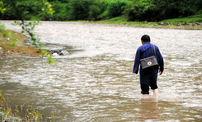 一个老药箱、一把老花伞、一双雨鞋、一个孤独的身影,匆匆行走在大山里,穿行在峡谷中。有时云贵交界处的马摆河水暴涨,有时要到河对岸的云南省得禄乡去急诊,朱大清只得绕开两公里外的小桥,涉水过河。很多次河水暴涨,他还是冒着被河水冲走的危险,不辞辛劳,解救马摆河两岸的乡亲们于病痛与危难之间。