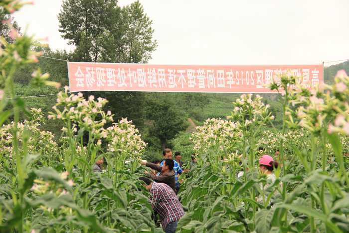 7月10日,高原烟海管理区2012年田间管理不适用鲜烟叶管理现场会在雪山镇召开。现场会对不适用鲜烟叶的管理的相关技术进行了现场培训。图为培训现场。