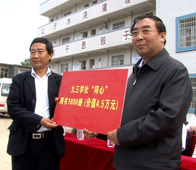 丛斌(右)代表九三学社中央向我县九三中学捐款图书