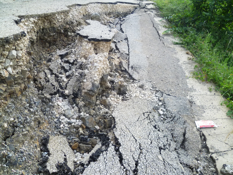 ▲近期,羊街镇突降大雨,造成五里岗至羊街通乡油路部分路段路面断裂、淤砂,路基垮塌,边沟淹没等灾害。灾情发生后,该镇及时向有关部门反应,并组织人员深入损毁公路现场抢修,以保证车辆畅通。图为被大水冲毁的公路路面。(毛庆松 摄)