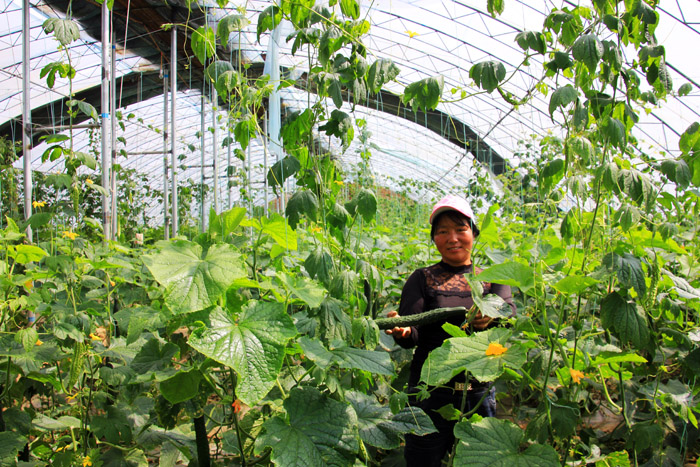 据介绍,基地集蔬菜“生产、加工、检测、销售”为一体,主要栽有番茄、黄瓜、苦瓜、茄子、辣椒、南瓜、金瓜等蔬菜品种,采取土地流转和“公司+基地+市场+农户”的运作模式,1个大棚年纯收入8万元以上,蔬菜种植区土地年均亩产值达8000元以上,每亩纯收入达5000元以上。通过土地流转,当地村民还能拿到1000元一亩的土地租金,在基地打工的村民,年收入达10000元以上。图为员工们正在采收黄瓜。 (何欢)