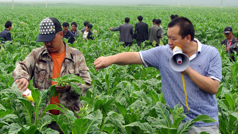 ▲7月16日,草海镇烟草技术人员深入银龙村烤烟基地对烟农进行烟株打顶抹杈培训。据了解,该镇今年种植烤烟7000亩,目前,正值烟株盛花季节,为提高烟叶产量和质量,确保烟农增产增收,该镇组织多支技术指导小组活跃在烟田,指导烟农加强田间管理。图为技术人员讲解化学抑芽剂的使用方法。 (陈姮 摄)