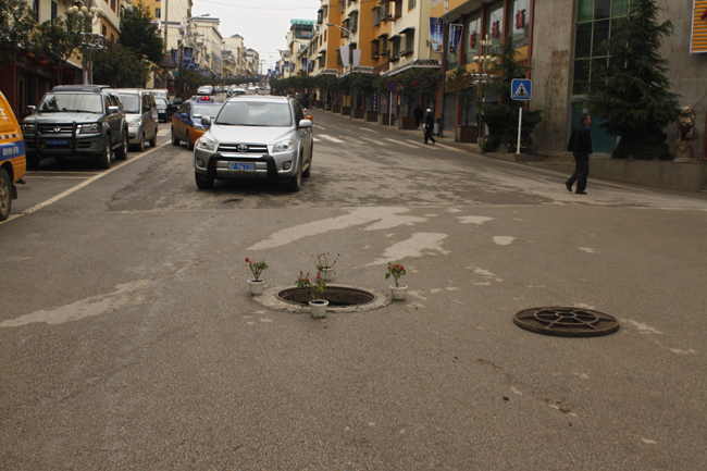 近日,记者在草海路发现,公路中间的下水道井盖被掀开在一旁。据路边开店的店主介绍,井盖被掀开,车辆在这里刚好又要转弯,所以特别危险,后来她只好搬来几盘花作为警示车辆,表示“此处有危险!”不过她还是希望相关部门及时来处理,以免造成不必要的交通事故。图为草海路上被掀开的井盖。 (本报记者 摄)