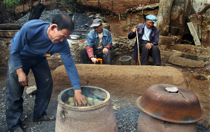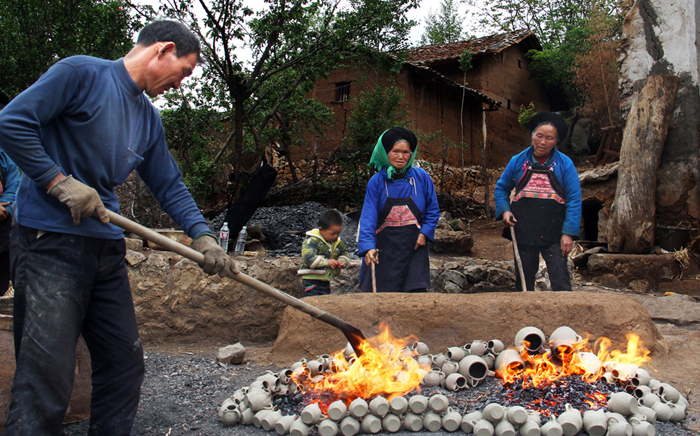 那时候,只要廖万清在家里开盘做罐,作坊门口就会密麻麻围了一群偷师学艺的小伙。小伙们都不敢堵住房门挡了廖师傅的采光,一个个就扒在门边上蹶着屁股探头探脑往里睃,看上去就像是在房门边上挂了两串硕大的葡萄。那时候,只要廖万清一走出家门,到处都有人师廖傅长廖师傅短地叫,到处都有人请他吃饭喝酒。路上见了廖万清,即使不同道也要笑着拐个弯过来跟他摆上几句。那时候,廖万清的心里是熨贴的,脸上是风光的。而这些熨贴的感受和风光的面子都来自于他的罐厂。是罐厂为他解决了一家老小的衣食住行,也是罐厂为他提供了施展技能的平台,才迎得了村里人的敬重。可自从茶罐生意关门后,家里经济就断了来路,房子早就破得不能住了也一直无钱翻修。家里的粮食也因为人多地少只能保证吃饭和喂一头年猪,连个可变卖的牲口都不敢养。廖万清不是没想过把家里的罐厂平了种地,可他实在是下不了手啊!每当看到作坊里的车盘、看到门口舂泥的碓窝、拉火的风箱、筛泥的晒场、烧罐的炉灶,廖万清就仿佛看到了列祖列宗们在罐厂上辛勤劳作的身影,他不想让世世代代的廖氏祖先苦心经营了一辈子,专承了几千年的“廖茶罐”毁在他的手上,他也不相信祖宗们一代一代手把手传下来的茶罐手艺会在他手里找上残缺的句号。他想,就算自已这辈子没有机会做茶罐,也要把罐厂保留下来,以后有了机会好让儿子再做茶罐。廖万清希望把这门祖传的手艺传授给儿子,他不想让这门技艺失传,更不想让生活在云贵高原的乌撒人使用了几千年的茶罐从他手上彻底消失。可儿子有儿子的打算,儿子不喜欢整天待在阴暗潮湿的作坊里做茶罐。