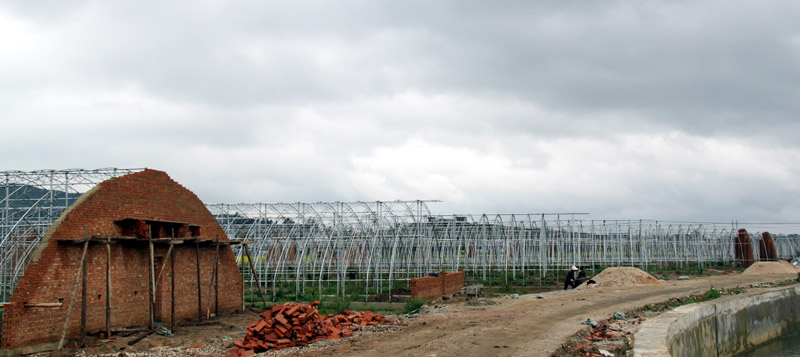 7月22日,落户我县草海镇的山东乐义集团乐义百家现代农业科技示范基地上,在2010年建设冬暖式日光温室15个的基础上,今年又新建29个。该基地建设核心示范基地1000亩,基地主推冬暖式日光温室冬春喜温果菜反季节生产技术,喜凉叶菜夏秋反季节生产技术,实施绿色食品产业化大开发,成为我县蔬菜种植的“新样本”。图为新建冬暖式日光温室基地远眺。 (本报记者 张锋)