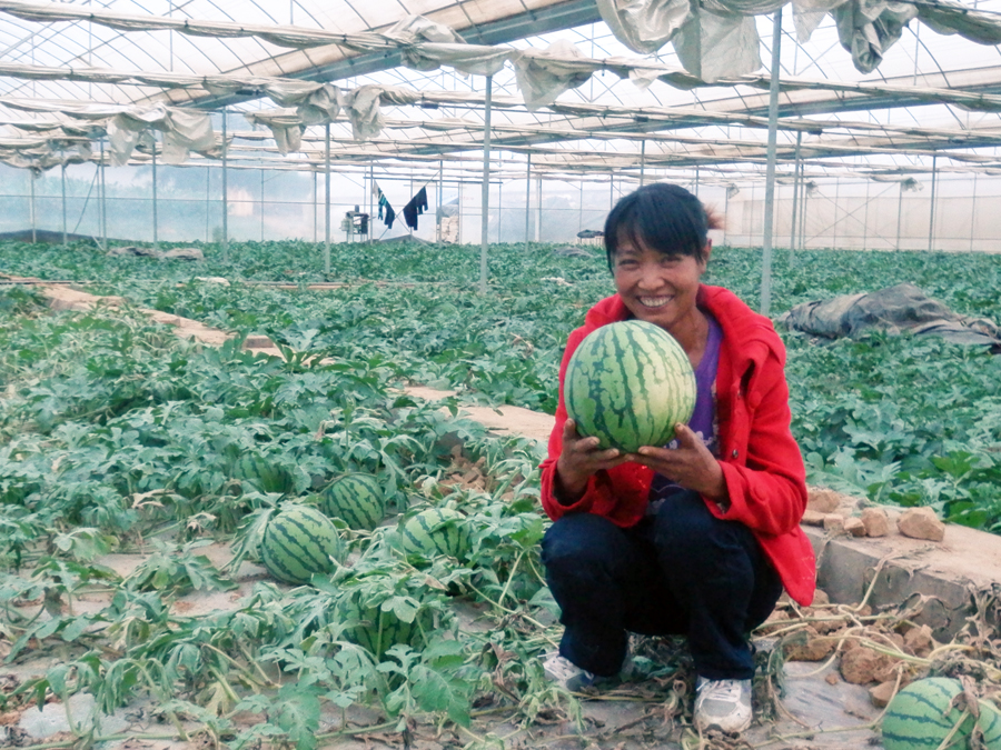 ▲今年4月初,来自龙街镇的余贵芬在牛棚镇响水村承包4个大棚种了8000余棵西瓜,预计可卖10万余元。牛棚镇从未种植过西瓜,此次余贵芬种西瓜成功,具有很强的示范作用,村民多了一条致富路。图为余贵芬抱着收获的西瓜笑了。(冶付红 摄)