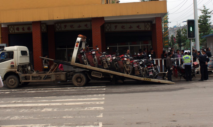 ▲7月20日,位于县城星光开发区红绿灯下面,一群违规违章的摩托在交警部门的执法下被请上了清障车。这是近期我县执法人员严厉打击和取缔道路交通领域内的非法违法行为的一个镜头。图为被拖走的摩托车。(本报记者 胡雍辉 摄)