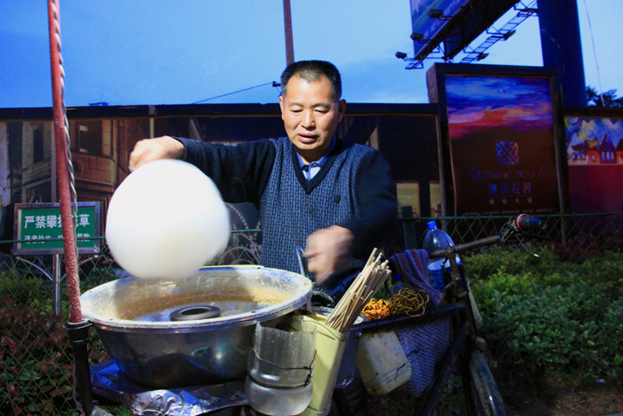 只要天气晴好的夜晚,游人增多,小贩随之增多:打气球、露天KTV、小地摊、烤豆腐……在众多小贩中,骑着自行车卖棉花糖的小贩在平凡凸显特别。