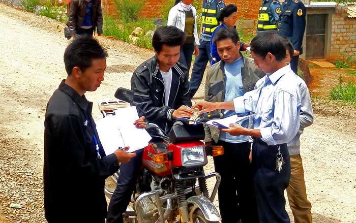 ▲7月21日,斗古乡组织安监、运管、派出所、综治等相关部门在集镇中心附近路段联合开展"打非治违"专项行动,重点治理机动车、摩托车辆违法违章行为。此次行动共查处5辆违法营运车辆。图为工作人员正在对摩托进行检查。(袁亮 摄)