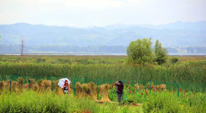 ▲7月20日,草海国家级自然保护区人工湿地污水处理系统生物床,吸引游客拍照留恋。昔日,人们一遇到污水就捂鼻闭嘴;今朝,草海神奇污水处理生物床,污水流进,清水流出,床上草茂花艳。图为游客在草海湖畔留影。 (本报记者 李玉荣 摄)