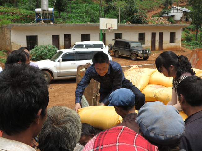 7月21日,为深入开展保持党的纯洁性教育试点工作,自治县政协副主席、财政局局长李正超带领财政局十余名党员干部深入海拉乡海元村开展党内“六心”教育主题实践活动,共捐款15600元,并购买86化肥包送到村民手中。 图为化肥捐赠现场。 (李正雨)