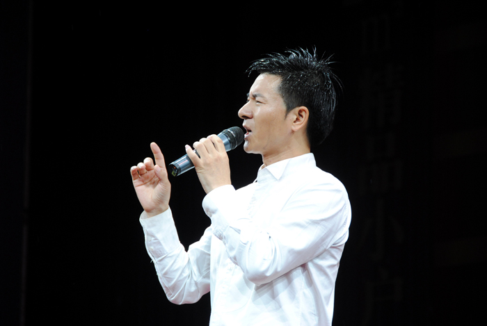 ▲我县首届房交会于7月22日落下帷幕。期间,主办方邀请刘德华模仿秀前来助阵房交晚会,长得酷似天王巨星刘德华的模仿者,一曲曲熟悉的"华氏情歌"唱响草海夏夜,点燃了现场追星热潮。而现场如梦似幻的激光表演,更把观众们带入了神奇的激光世界。图为刘德华模仿秀在演唱。(本报记者 杨文斌 摄)