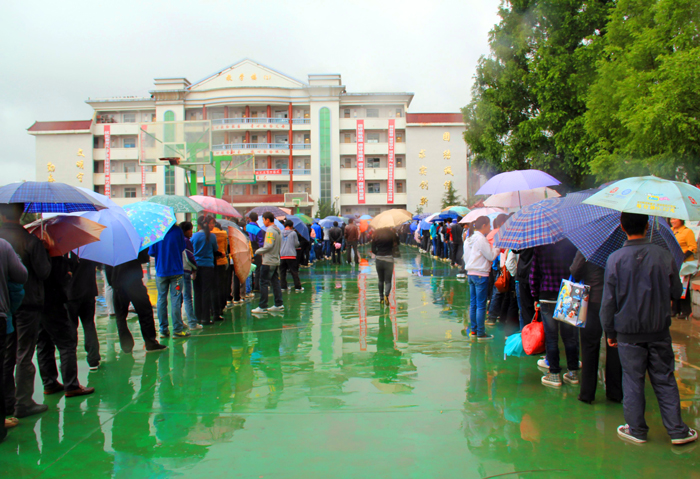 ▲7月25日,我县民族中学高一新生开始报名。记者看到,前来报名的学生在雨中排起长长的队伍,等候报名。据了解,今年该校招收高一新生3000名。(本报记者 李玉荣 摄)