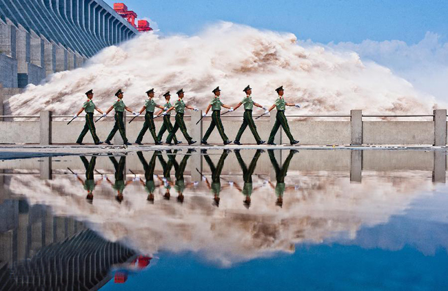 7月24日,武警宜昌支队九中队官兵在三峡大坝前巡逻。当日晚8时许,三峡水利枢纽迎来蓄水成库9年来的最强洪峰,峰值高达每秒7.12万立方米。面对历史罕见洪峰,三峡枢纽积极发挥防洪功能,有效拦水削峰。监测显示,洪峰通过时三峡枢纽建筑物、机组各项指标正常稳定。(新华社记者 肖艺九 摄)