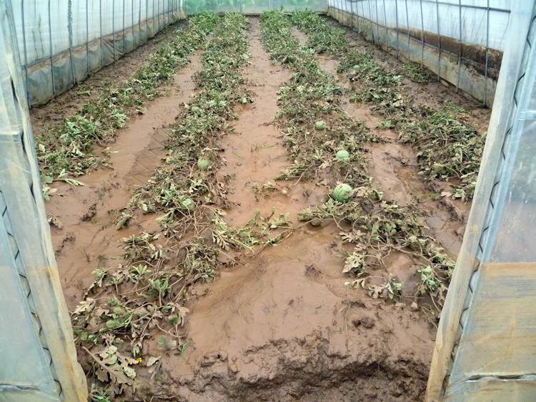 ▲7月27日晚,羊街镇突降暴雨,致使该镇牛角井、兴隆厂等6个村农作物遭受到不同程度破坏。据统计,此次暴雨共造成该镇6个村32个村民小组426户2460人受灾,农作物受灾面积达1670亩,烤烟受灾面积270亩,中药材受灾面积140亩,其他农作物受灾面积1260亩。图为被洪水淹没的大棚西瓜。(羊街党政办)