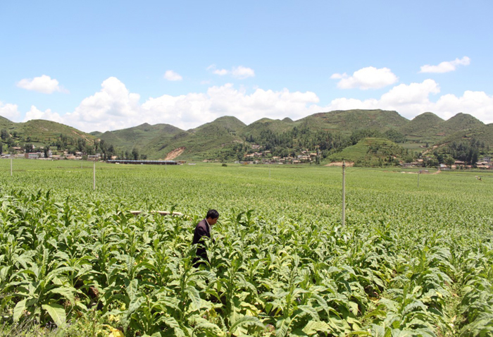 ▲7月29日,记者在小海镇松山大坪子看到,茫茫万亩烟田绿浪滚滚,丰收在望。据了解,今年我县种植烤烟35万亩,涉及烟农4万多户。目前,正是烤烟采摘烘烤季节,烟农们忙得不可开交。图为烟农正在田间打顶抹杈。(本报记者 胡雍辉 摄)