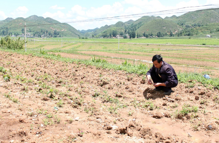 ▲7月29日,记者在小海镇看到,由威宁县万源恒种养殖专业合作社实施的万亩(GAP)中药材种植示范基地已收到良好成效,基地涵盖该镇松山、松棵、坪山等13个村,涉及农户1798户。据了解,该基地由市科技局、县科技办和中药办作技术指导,基地去年种植中药材2000亩,今年种植4000亩,预计明年种植5000亩。图为技术人员在基地里查看幼苗长势。(本报记者 胡雍辉摄)