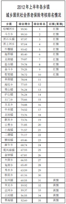 2012年上半年各乡镇城乡居民社会养老保险考核排名情况